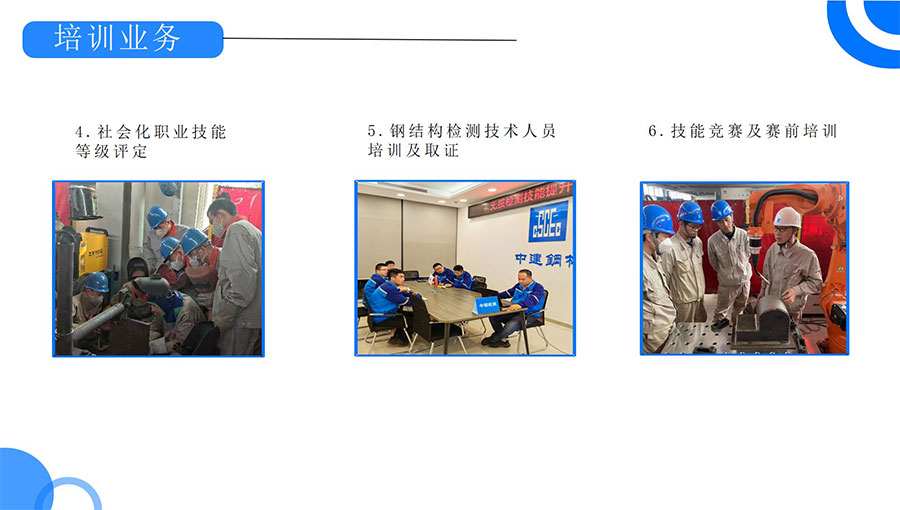 中建鋼構(gòu)國(guó)家高技能人才培訓(xùn)基地?fù)碛兄袊?guó)工程建設(shè)焊接協(xié)會(huì)基層鋼結(jié)構(gòu)焊工技術(shù)考試委員會(huì)資質(zhì),是英國(guó)勞氏“國(guó)際焊工/焊接操作工聯(lián)合培訓(xùn)考試中心”,具備歐標(biāo)、美標(biāo)、俄標(biāo)、日標(biāo)焊接資格培訓(xùn)和美標(biāo)認(rèn)證資格。同時(shí)具有“海河工匠”培訓(xùn)基地、李朋朋技能大師工作室、東西扶貧勞務(wù)協(xié)作就業(yè)實(shí)訓(xùn)基地、國(guó)際焊工/焊接操作工培訓(xùn)考試中心等資質(zhì)。