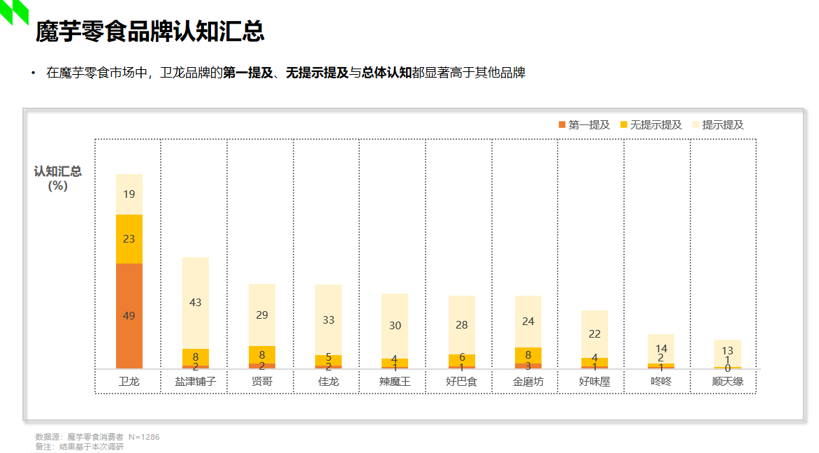 據(jù)2022年尼爾森調(diào)研顯示,在魔芋市場中,衛(wèi)龍品牌的第一提及、無提示提及與總體認(rèn)知都顯著高于其他品牌。顯然,衛(wèi)龍發(fā)明的魔芋爽在市場中已然奠定了良好且堅固的受眾認(rèn)知基礎(chǔ),那么“小魔女”的加入,不僅進(jìn)一步充實(shí)了衛(wèi)龍自身的產(chǎn)品矩陣,占位了“魔芋素毛肚”的產(chǎn)品類目,也將引領(lǐng)魔芋休閑食品賽道邁向更高品質(zhì)的發(fā)展方向,為市場打開全新的增量機(jī)遇。