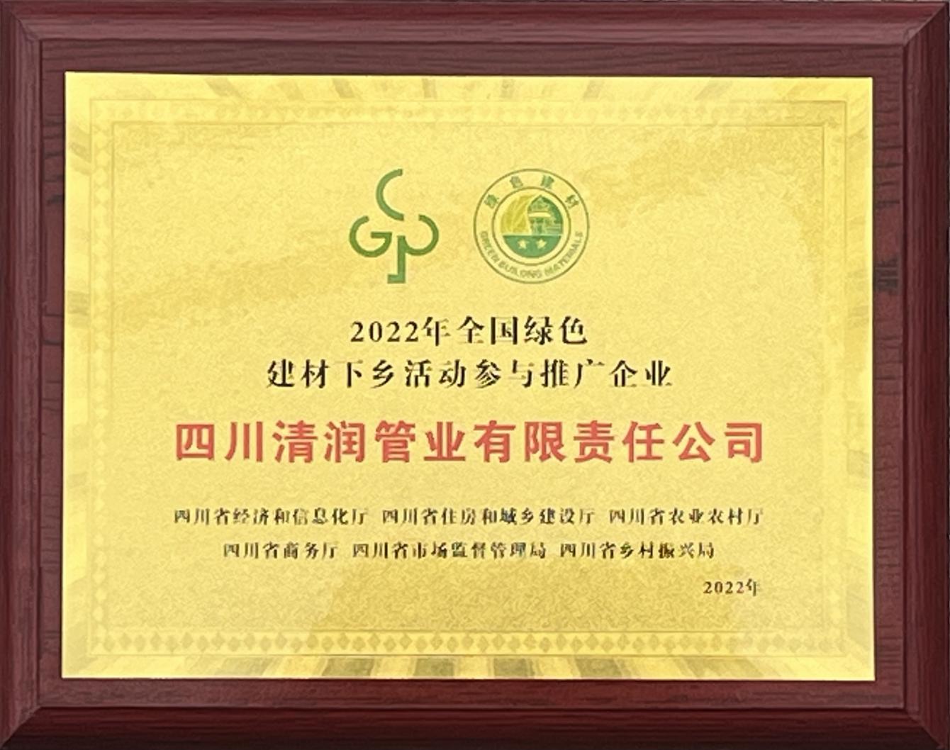 “清潤”自成立以來,便以“打造安全的城市地下生命線”為己任,先后為農(nóng)飲工程、四川大學(xué)、西南民族大學(xué)、第31屆世界大學(xué)生夏季運(yùn)動會場館等項(xiàng)目供應(yīng)了一系列的優(yōu)質(zhì)給水管材管件產(chǎn)品,得到了市場廣大客戶和社會各界的一致肯定。公司先后獲得了“四川名牌”、成都市市級守合同重信用企業(yè)稱號,入選《全國農(nóng)村飲水安全工程材料設(shè)備產(chǎn)品信息年報(bào)》、《成都市地方產(chǎn)品配套目錄》,信用等級AA級,成為中國塑料加工工業(yè)協(xié)會塑料管道專業(yè)委員會理事單位、中國工業(yè)防腐蝕技術(shù)協(xié)會、四川燃?xì)鈪f(xié)會等協(xié)會會員單位。2022年,在全國綠色建材產(chǎn)品四川站啟動會上,四川清潤管業(yè)還作為優(yōu)秀代表企業(yè)獲得授牌。