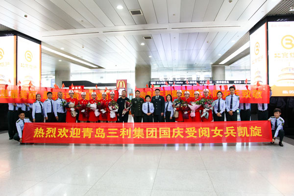 2019年10月5日是個(gè)歡樂(lè)的日子,青島流亭機(jī)場(chǎng),9名身著紅色受閱服裝的姑娘們一下飛機(jī),就受到了熱烈歡迎,幾名姑娘在與前來(lái)迎接她們的同事?lián)肀r(shí)激動(dòng)地流下了淚水。這9名成員是青島三利集團(tuán)參加慶祝中華人民共和國(guó)成立70周年大閱兵的鏗鏘玫瑰。就在幾天前,她們作為民兵方隊(duì)成員走過(guò)天安門(mén)廣場(chǎng),接受祖國(guó)和人民檢閱,成為許多人眼中一道靚麗的風(fēng)景線。