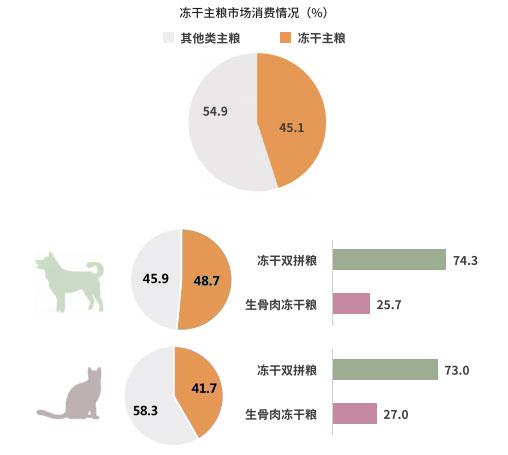 據(jù)朗諾與派讀調(diào)研數(shù)據(jù)顯示,目前,寵物凍干類產(chǎn)品在主糧、零食市場(chǎng)的偏好度均持續(xù)提升,凍干主糧在犬、貓糧中的滲透率分別為 48.7%、41.7%,凍干零食的滲透率則為 45.4%。其中凍干雙拼糧仍是最受寵物主歡迎的主糧產(chǎn)品,貓凍干主糧及零食市場(chǎng)仍有較大的增長空間與市場(chǎng)潛力。