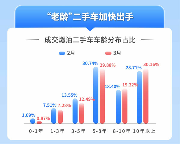 據(jù)天天拍車數(shù)據(jù)顯示,3月燃油二手車成交車齡分布中,8-10年車齡成交占比為19.32%,10年以上成交占比為30.16%,合計占比49.48%;相較于2月,8-10年車齡成交占比為18.40%,10年以上成交占比為28.71%,合計占比47.11%,環(huán)比提升2.37%。此外,3月0-3年車齡的次新車成交占比為8.15%,比2月微跌0.45%,3-8年車齡成交占比為42.37%,比2月下降1.92%。數(shù)據(jù)顯示了在多重因素影響下,車主一方面選擇出手“老齡車”,對于次新車選擇“惜售”觀望。