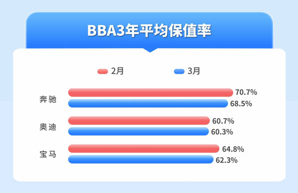 寶馬、奔馳、奧迪品牌是消費者熱衷的豪華汽車品牌,在二手車市場交易熱度較高,也是二手車經(jīng)銷商收車較多的類型。3月BBA品牌3年平均保值率行情,表現(xiàn)最高的是奔馳品牌,其3年平均保值率為68.5%,較2月下滑2.2%;其次是寶馬品牌,其3年平均保值率為62.3%,較2月下跌2.5%;奧迪品牌3年平均保值率為60.3%,較2月微跌0.4%。