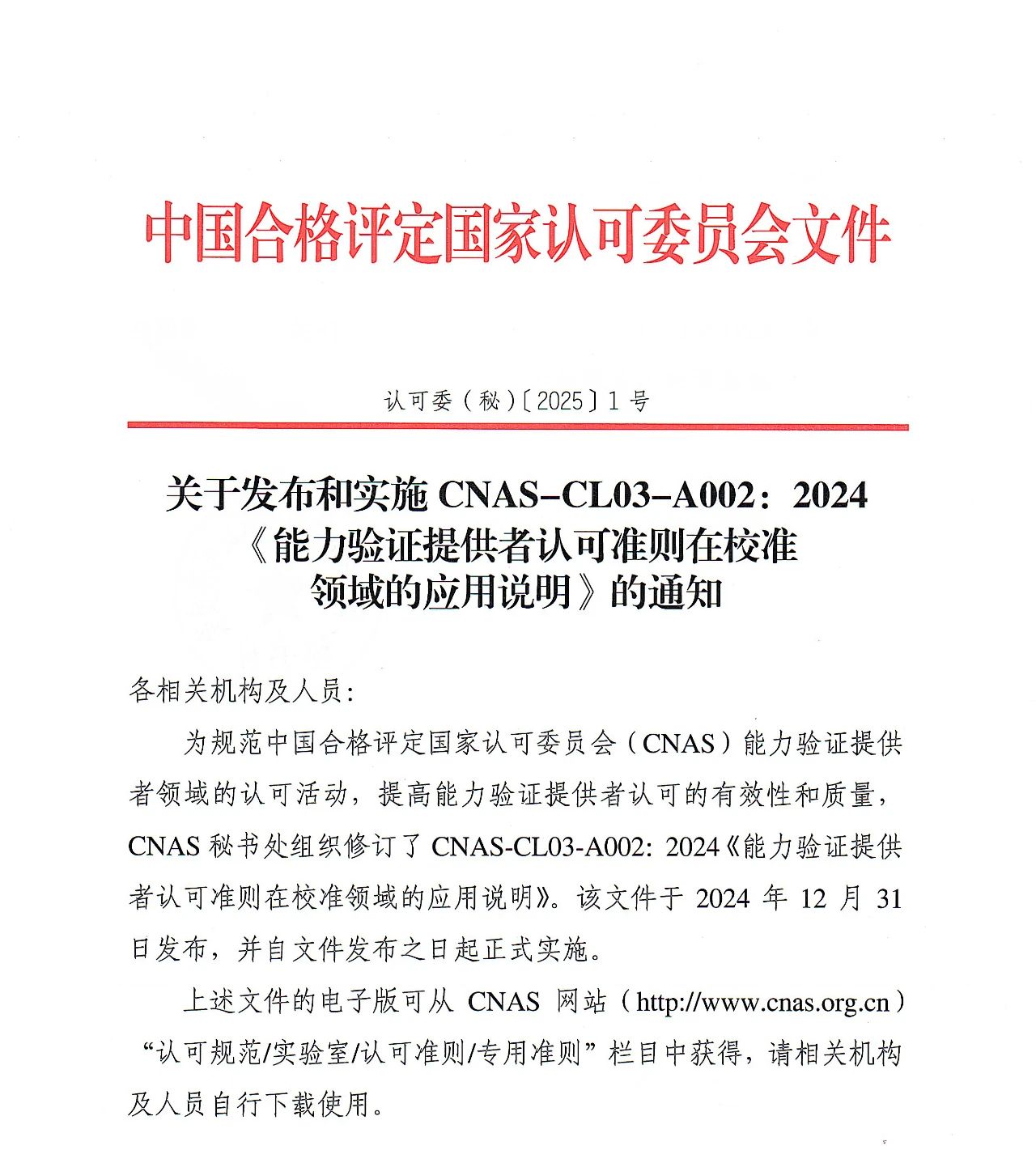 近日,中國合格評定國家認(rèn)可委員會(CNAS)發(fā)布通知,CNAS 秘書處組織修訂了CNAS-CL03-A002:2024《能力驗(yàn)證提供者認(rèn)可準(zhǔn)則在校準(zhǔn)領(lǐng)域的應(yīng)用說明》。該文件于2024年12月31日發(fā)布,并自文件發(fā)布之日起正式實(shí)施。