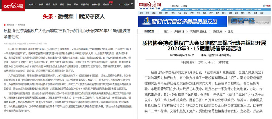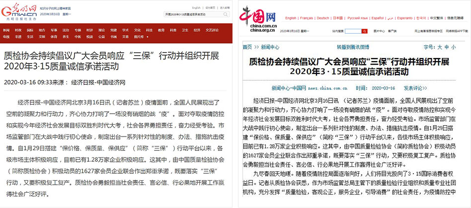 中國網(wǎng)《質(zhì)檢協(xié)會持續(xù)倡議廣大會員響應(yīng)“三保”行動并組織開展2020年3·15質(zhì)量誠信承諾活動》