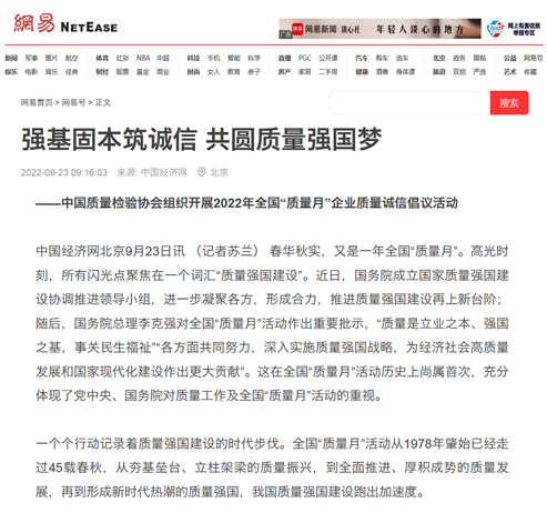 網(wǎng)易網(wǎng):強(qiáng)基固本筑誠(chéng)信 共圓質(zhì)量強(qiáng)國(guó)夢(mèng)——中國(guó)質(zhì)量檢驗(yàn)協(xié)會(huì)組織開(kāi)展2022年全國(guó)“質(zhì)量月”企業(yè)質(zhì)量誠(chéng)信倡議活動(dòng)
